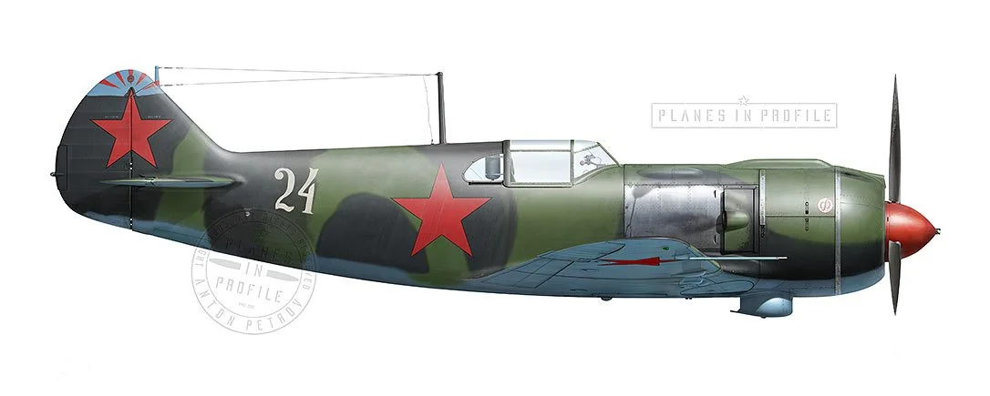 General) The airplane is a La-5F, Type-37 machine (Basically an early version of the La-5F) as is determined by the ‘high back’ fuselage, canopy, and the marks on the engine cowling and the tip of the fin where we would expect to find the La-5F’s ‘F’ symbols. The plane is painted with the Green/Black camo with the usual ‘early design’ stars most likely appearing in the standard 6 positions - two on the fuselage, two on the tail, two on the underwings. The plane was probably similarly weathered to the airplane in the foreground of the photo which features White-24.