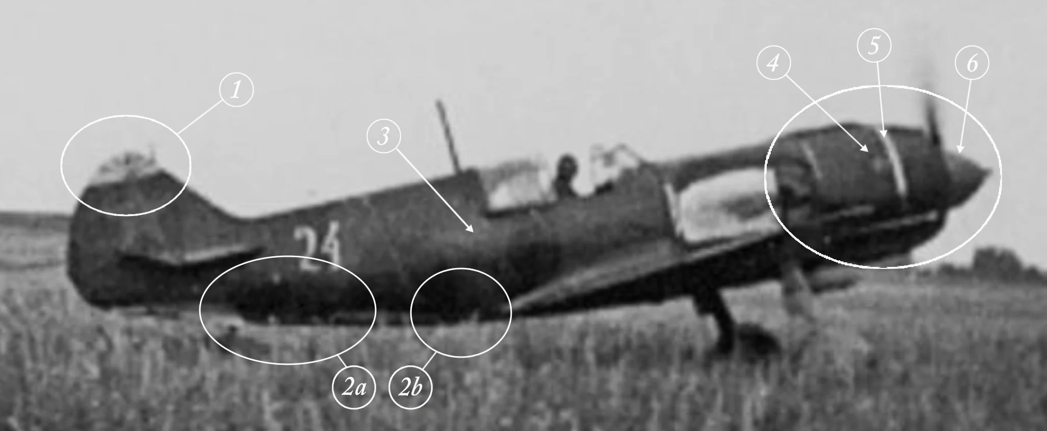 2) There appears to be some repainting work in the area indicated by the ‘2a’ and ‘2b’ arrows. The darker paint seems to reach all the way to the bottom of the fuselage. This might have been a repair job of some sort. It’s also possible that the paint in the area marked ‘2a’ was applied in order to cover a previously existing marking, such as maybe a white band painted around the fuselage, similar to White-06, or Vendl’s White-24.