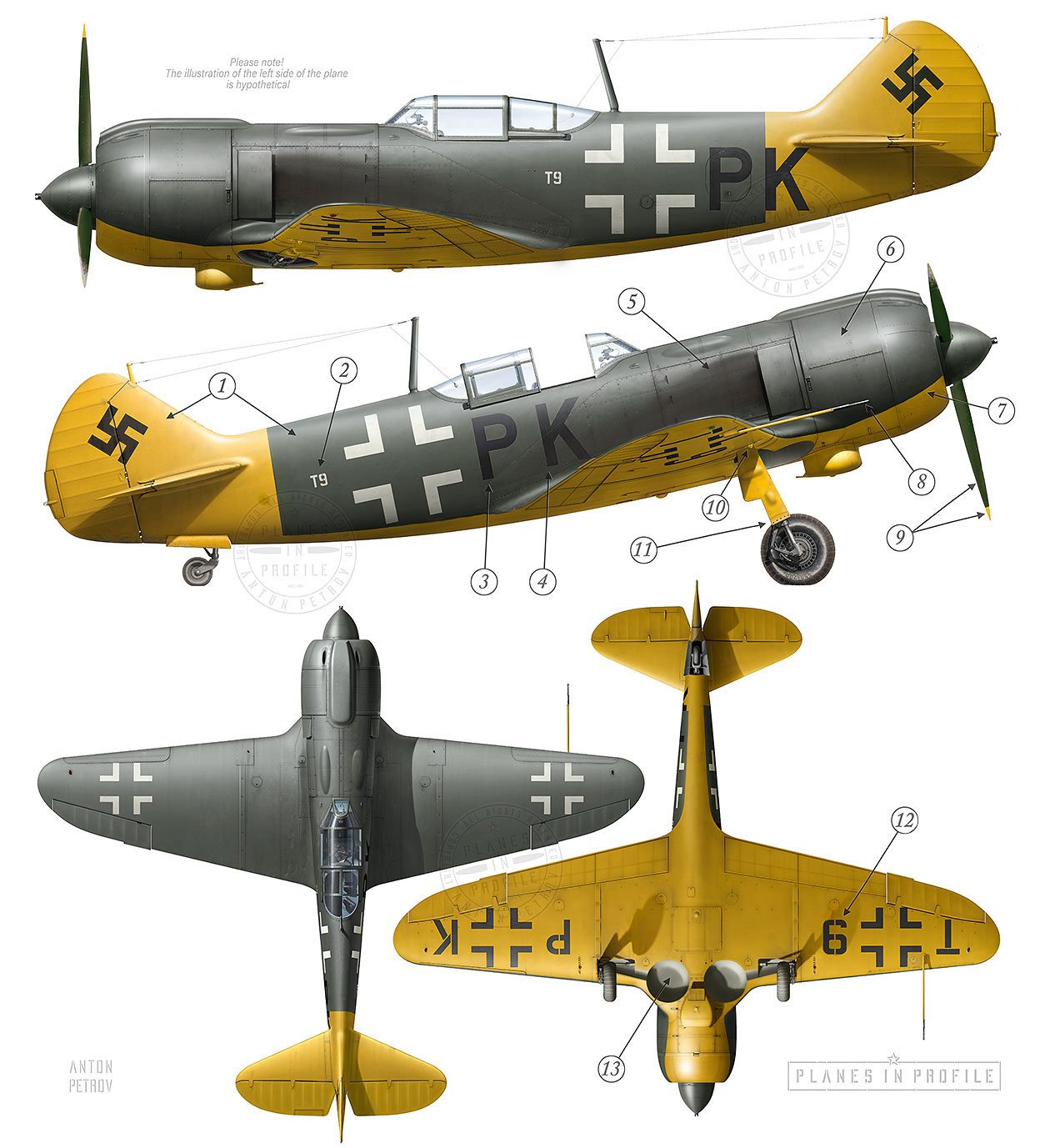 “Captured White-21” and “T9+PK” were supposedly the same La-5FN airplane. The reason for supposing this is because the photos of the two airplanes share some clues to suggest this idea, such as the missing wheel guards on both planes or the uncommonly high demarcation line between the lower and the upper colours on the “chin” of both planes (most likely T9+PK’s livery followed a similar demarcation line to that of the “Captured White-21” when it was repainted). There is also the fact that many of the captured Allied planes, after being extensively tested in Rechlin (like White-21 was), were then passed on into the 2./Versuchsverband Ob.dL (Later OKL) where they were repainted with the same liveries as T9+PK. And the last reason for supposing that the two are the same plane is that I was unable to find information about Luftwaffe possessing more than one airworthy La-5FN airplane (other than the photos, which are probably showing the same, but repainted, airplane).