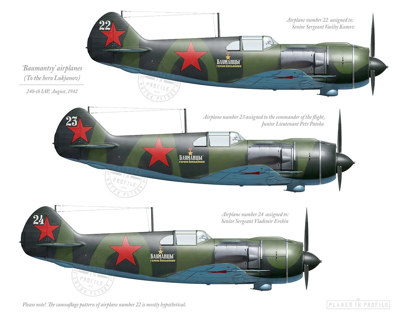 In the lead-up to the battle for Stalingrad, the young men of 240th IAP had the honour of receiving three airplanes with an inscription "Baumantsy" - to the hero Lukyanov! Lukyanova Maria Ivanovna who was the mother of H.S.U., A.M.Lukyanov, raised funds from the workers of the factory in the Bauman district of Moscow for the construction of these airplanes.