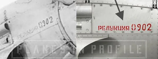 2. 'Редукция 0902’ (Reduction 0902), specifies the reduction in the engine gear ratio. Please note! We don’t have a confirmed photo of Red-8 from the left side, therefore the details in point ‘2’ are based on a photo of a MiG-3 from 27th IAP which may or may not be Red-8. It appears that the last three digits of the technical marking (902) are hand drawn, while the rest appears to be stencilled.