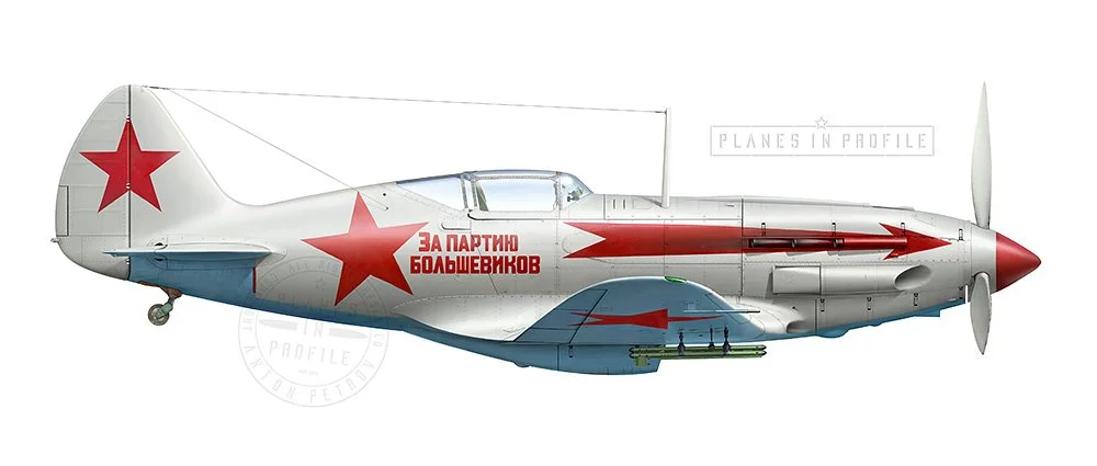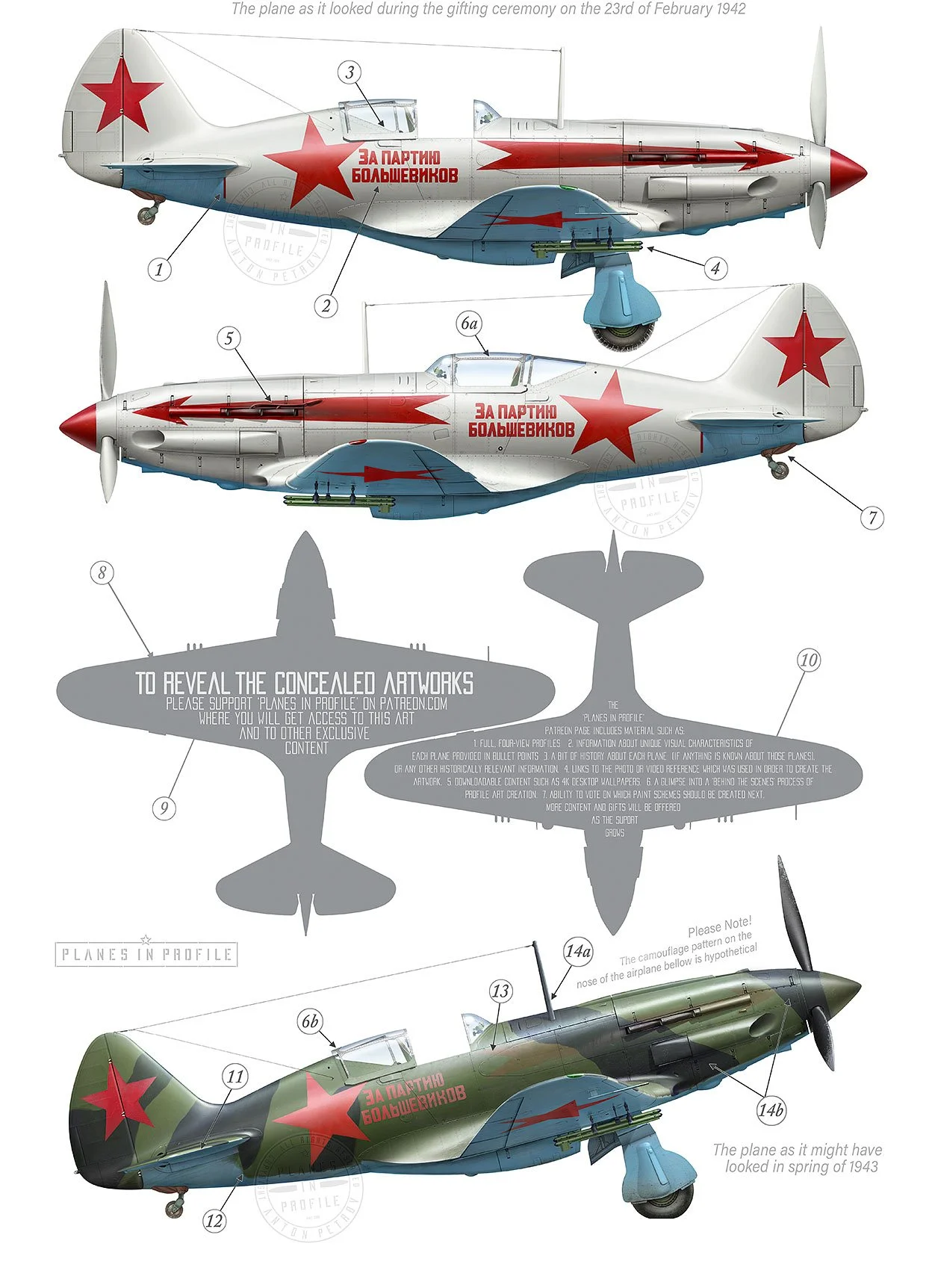 14. Please Note! The camouflage pattern on the nose of this airplane indicated by ‘14b’ is hypothetical. The antenna mast, indicated by ‘14a’ looks like it was painted black, which serves as one clue is one clue as to what the camo pattern might have looked like. The camouflage pattern of the “Za rodinu” airplane serves as another clue, if we’ll presume that the two airplanes had a similar camo pattern.