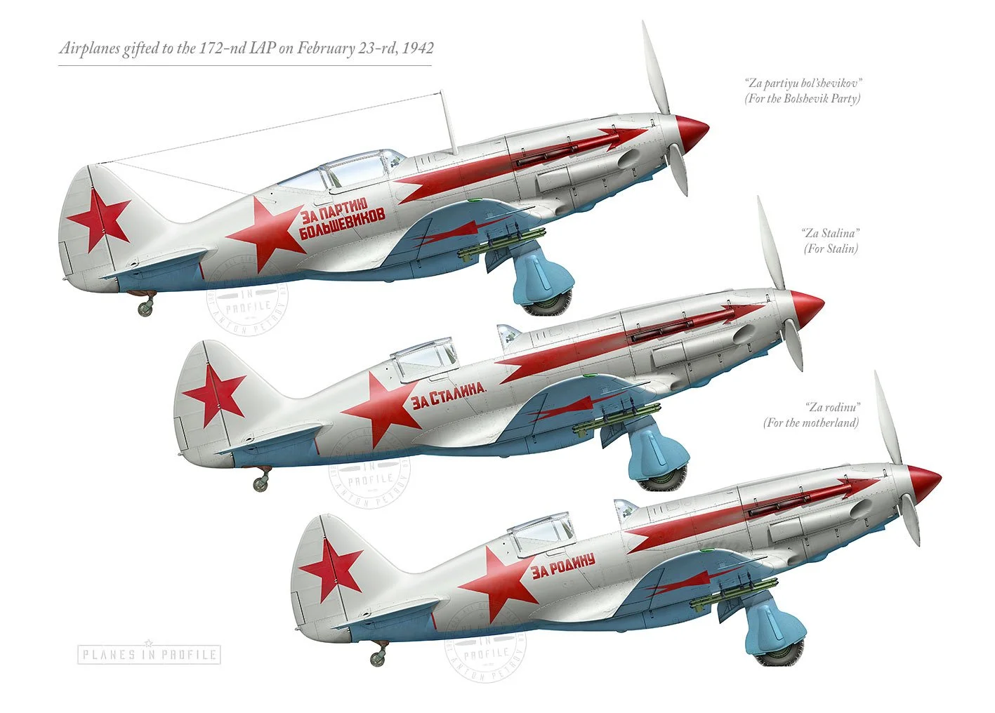 “Za Partiyu Bol’shevikov” was one of the three airplanes which were gifted by the workers of Moscow’s Aircraft Repair Plant number 1 named after Stalin, to the aviators of the 172nd IAP, on February 23rd 1942. The other two airplanes were ‘Za Rodinu’ and ‘Za Stalina’ . 172nd IAP was equipped with LaGG-3 and Yak-1 airplanes at the time of the ceremony and did not have any pilots who were trained to fly the MiG-3, therefore these machines were passed on to the 122nd IAP.