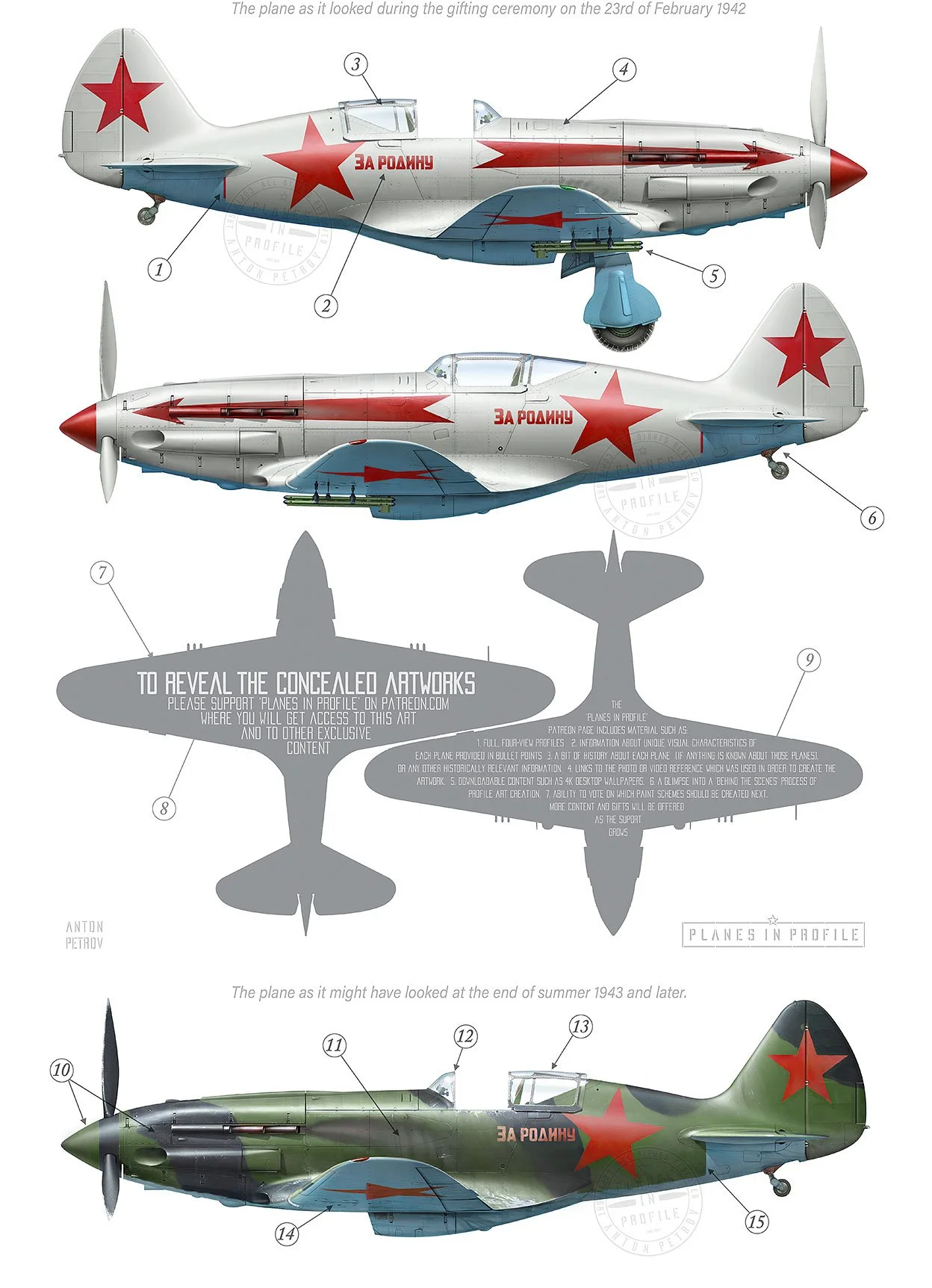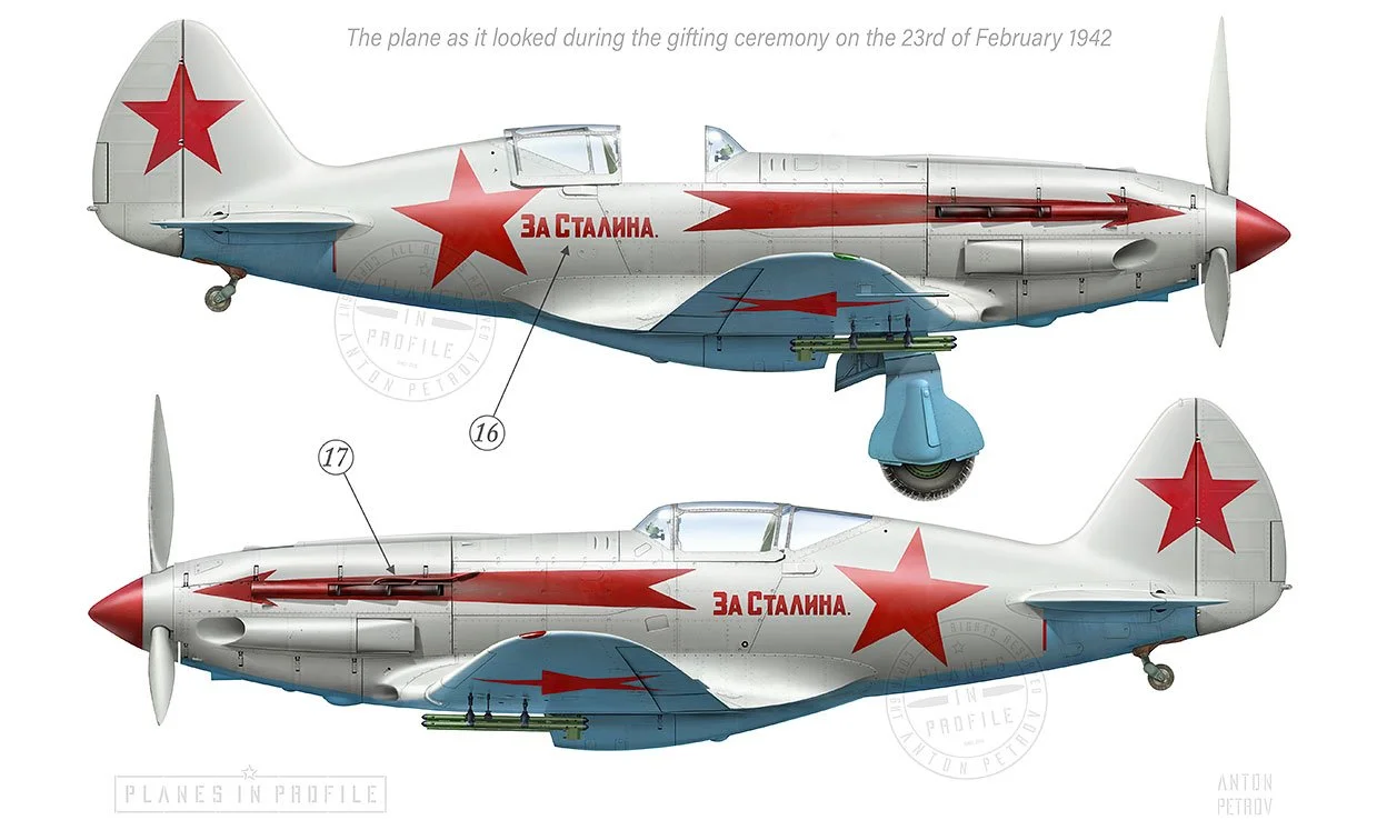 ‘Za Rodinu’ was flown by Rybalko in the spring and summer of 1942, the period which included the Rzhev-Sychev summer offensive operation in which Rybalko took part. During some of that time 122nd IAP was already equipped with Yak planes. It is difficult to know when exactly Rybalko started to fly the Yak airplanes, but all of his confirmed victories (7 of them [2]) were scored when flying a Yak plane.