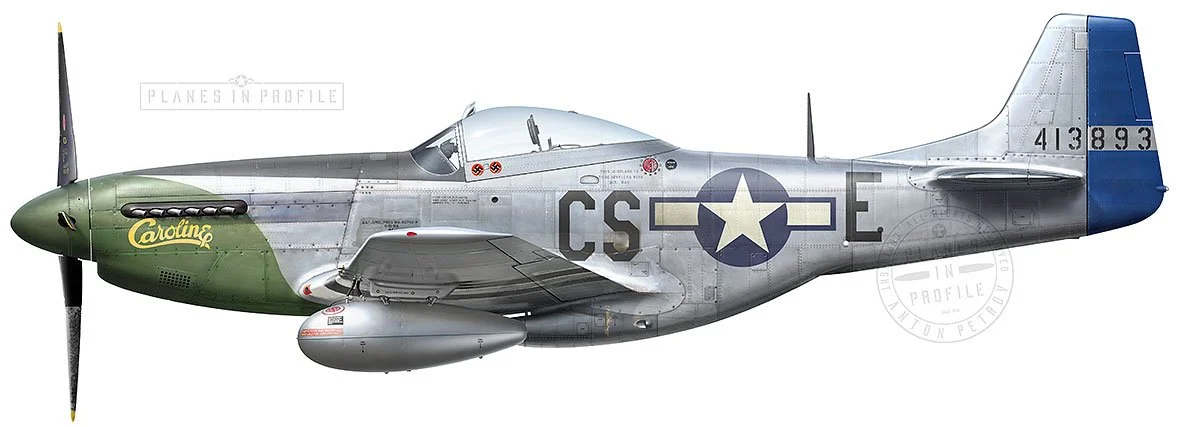 P-51D with a serial number 44-13893 is popular airplane, partly because it’s been relatively well photographed while being stationed in East Wretham, England. Colour photos of this machine can be found on the website of the American Air Museum in Britain. This airplane is one of 359th FG’s longest serving P-51Ds, having served with the group from 1944 until after the war. It was assigned to Lt. T.P. ‘Teepee’ Smith who had recently rejoined the 359th FG following a 5 months journey back to England through enemy occupied territory after baling out of his fuel-starved P-47 behind enemy lines in Netherlands on the 11th of April, 1944. Smith christened his new fighter ‘Caroline’ and this became the plane in which ‘Teepee’ reached his highest achievement of the war when he scored two air victories (and two probables) in this machine, all during the same air battle on November 21st, 1944.