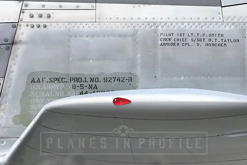 7) The data stencil looks like it was applied over a repainted (darker background) spot and the crew names are visible just below the canopy. These appear to have been completely erased in the later photos.