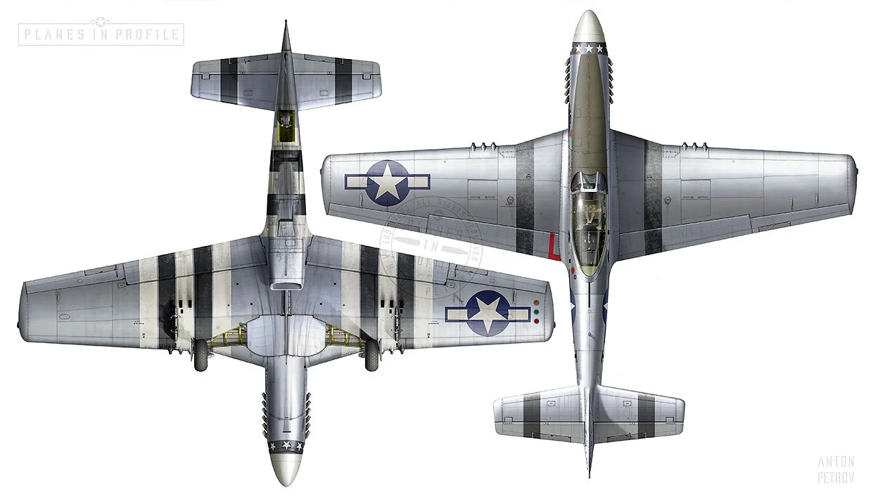 It’s worth noting the star-spangled black band around the tip of the nose. This was the identification marking of the 356th FS’s Mustangs during summer and autumn of 1944. S/Sgt Mark Hanson and Sgt Louie painted this marking on the squadron’s airplanes, as instructed by Turner . This marking replaced the previously solid white tip of the nose, and was in turn replaced by a solid red tip of the nose in Feb 1945(with the spinner painted red also).